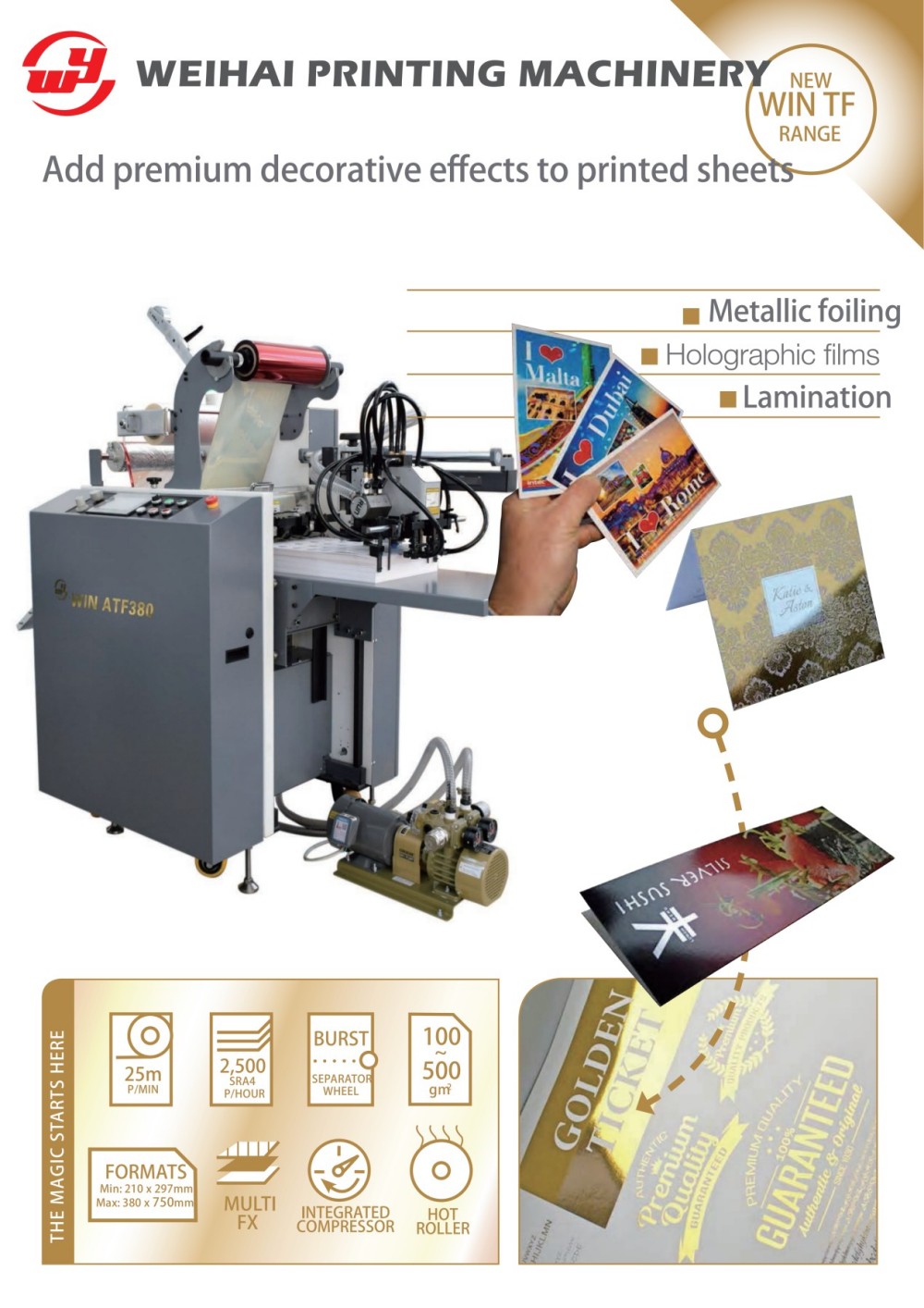 380 mm təbəqə ilə qidalanan laminasiya və folqa presi ənənəvi isti ştamplama lövhələri olmadan avtomatik olaraq metal və rəngli naxışları isti ştamplama qabiliyyətinə malikdir. O, yalnız qısamüddətli tələb olunan rəqəmsal proqramlar üçün deyil, həm də ənənəvi litoqrafiya ofset çıxışları üçün uyğundur. O, avtomatik olaraq nöqtə və su dalğası naxışlarını yaratmaq üçün holoqrafik filmlərdən istifadə edərək çap materiallarını daha da incə edir.