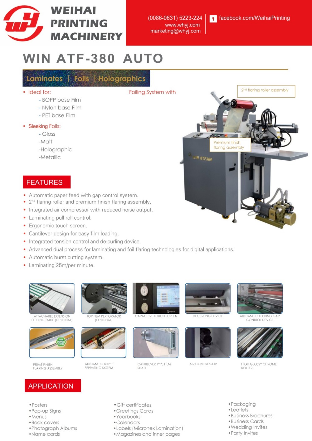 Avtomatik Yem Laminasiya və Folqalama Maşını Weihai Printing Machinery Co., Ltd tərəfindən dizayn edilmiş və istehsal edilmiş əl ilə kağız qidalandıran laminasiya və metal folqalama avadanlığıdır. Kompakt dizaynı ilə o, həm laminatlama, həm də metal folqalama funksiyalarını birləşdirərkən emalatxana sahəsinə qənaət edir və bu, daxili dekorativ emal tələb edən müəssisələr üçün uyğundur. O, adi çap materiallarını yüksək dərəcəli incə hazır məhsullara çevirə bilər və həm rəqəmsal tələb olunan tətbiqlərə, həm də ənənəvi litoqrafiya ofset çaplarına tam uyğun gəlir. Optimal emal nəticələrini təmin etmək üçün maşın işləmə sürəti, kağız qalınlığı və dizayn nümunələri kimi əsas dəyişənlərə uyğun olaraq iş zamanı rulonun təzyiqini və istilik temperaturunu tənzimləyən elektron idarəetmə cihazı ilə təchiz edilmişdir. Yüksək performanslı əl ilə qidalanan isti ştamplama və laminatlama avadanlığı olaraq, müştərilərin məhsullarının əlavə dəyərini əhəmiyyətli dərəcədə artırmaq üçün təsdiq edilmişdir. Müştərilər müxtəlif dekorativ tələblərə cavab vermək üçün geniş çeşiddə laminat filmləri və metal folqaları seçə bilərlər. Bundan əlavə, bannerlər və əlavə uzun çap materialları yerləşdirmək üçün uzadılmış kağız qidalanma masası ilə təchiz edilmişdir.